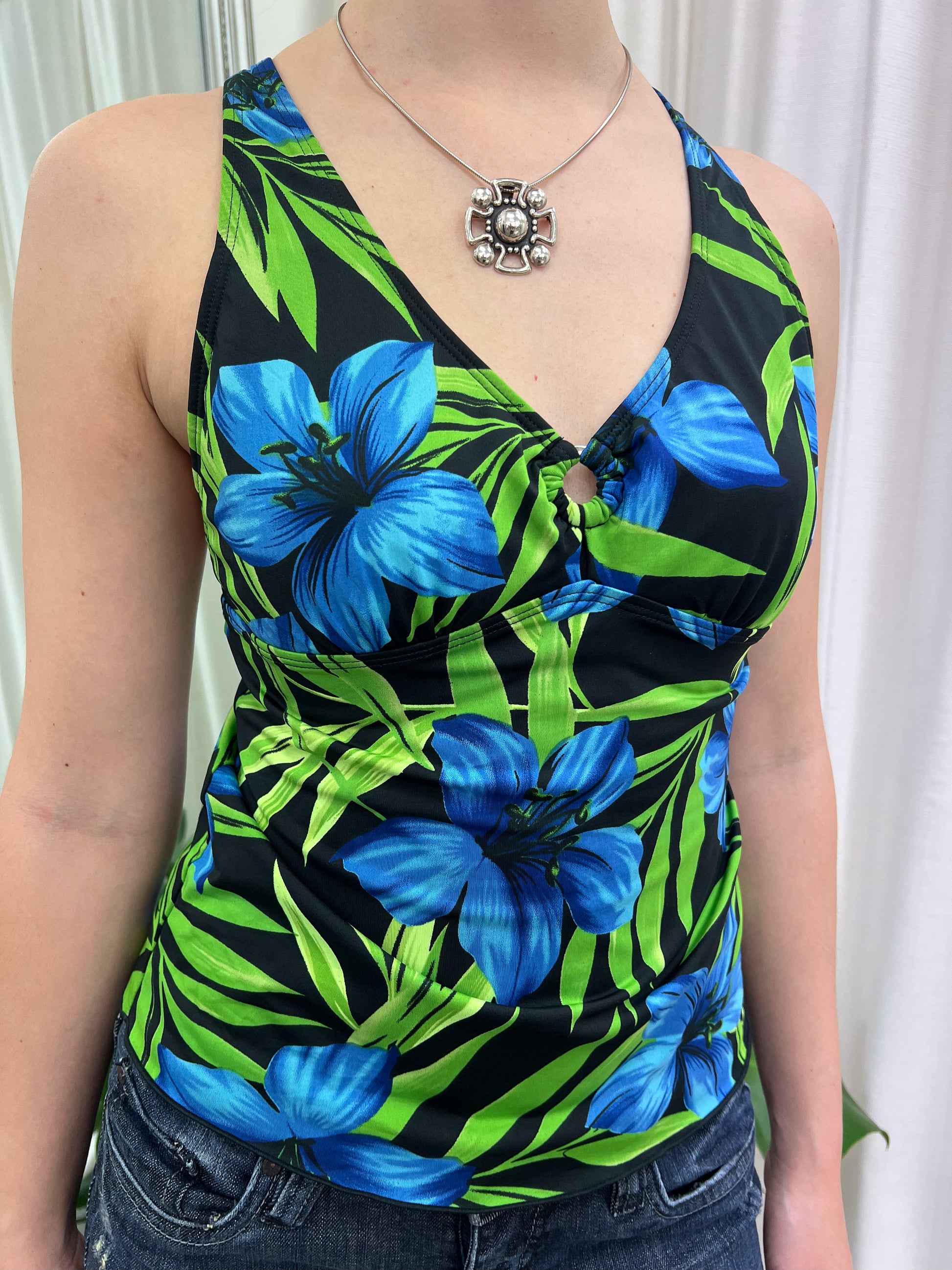 Product details: V neck tankini with metal O ring detail at bust. Straps can be worn tied as a halter top or crossed over at back and buttoned. Bust is lined.
