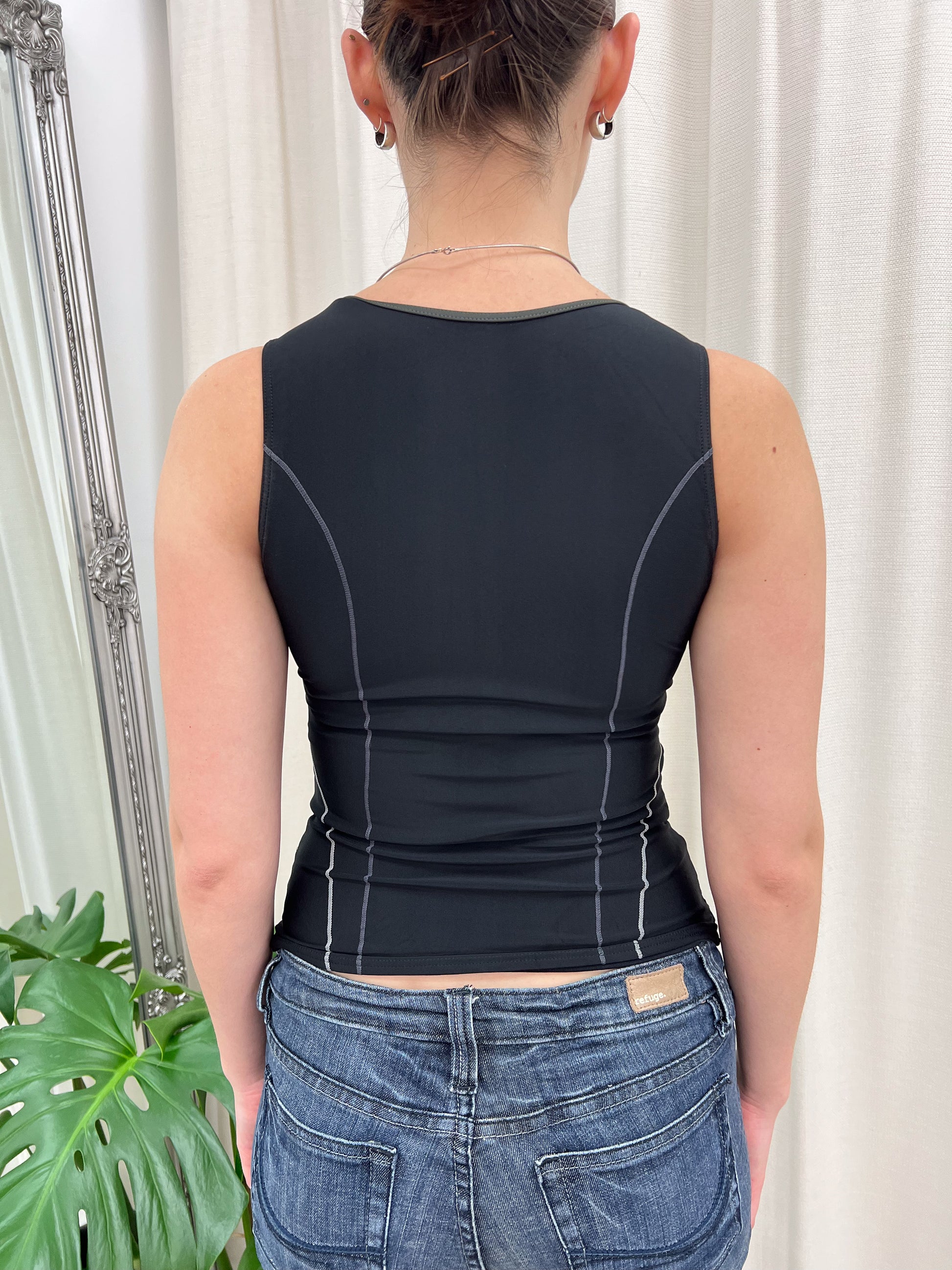 Product details: Stretchy sleeveless sports tank with zip front closure. Contrast stitching and colour blocked panels.