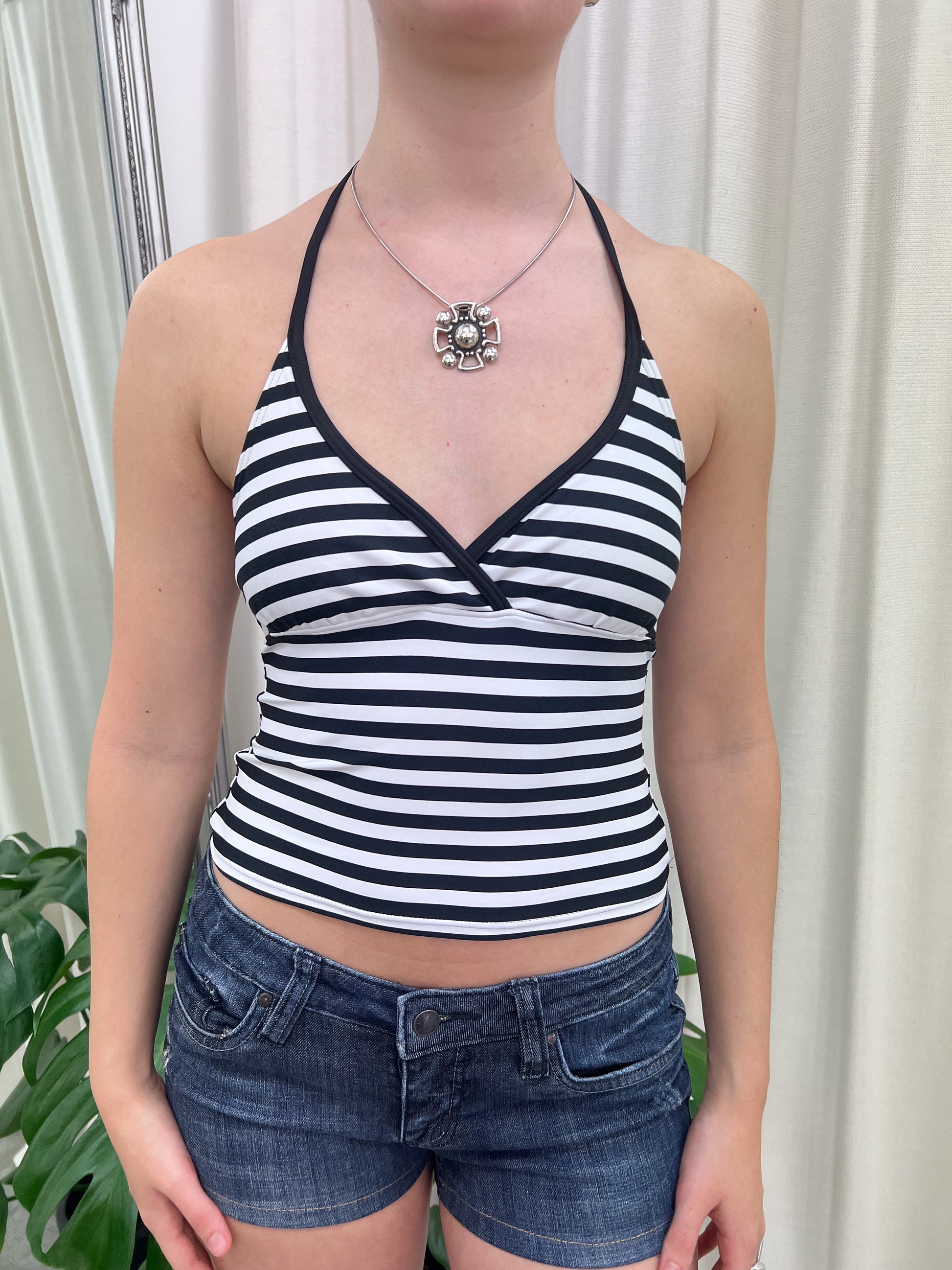 Product details: Halter tankini top with low v neck and slightly cropped length. Bust is lined.