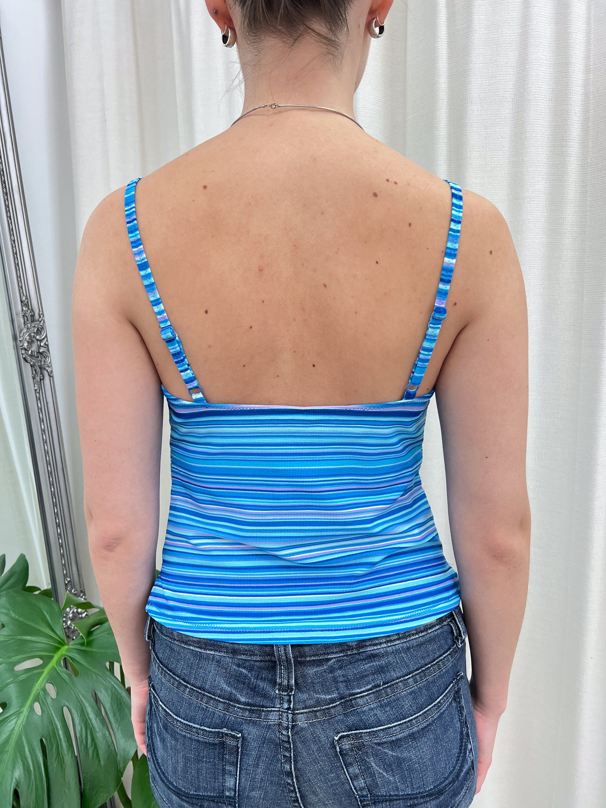 Product details: Striped tankini top with adjustable straps. Unlined.