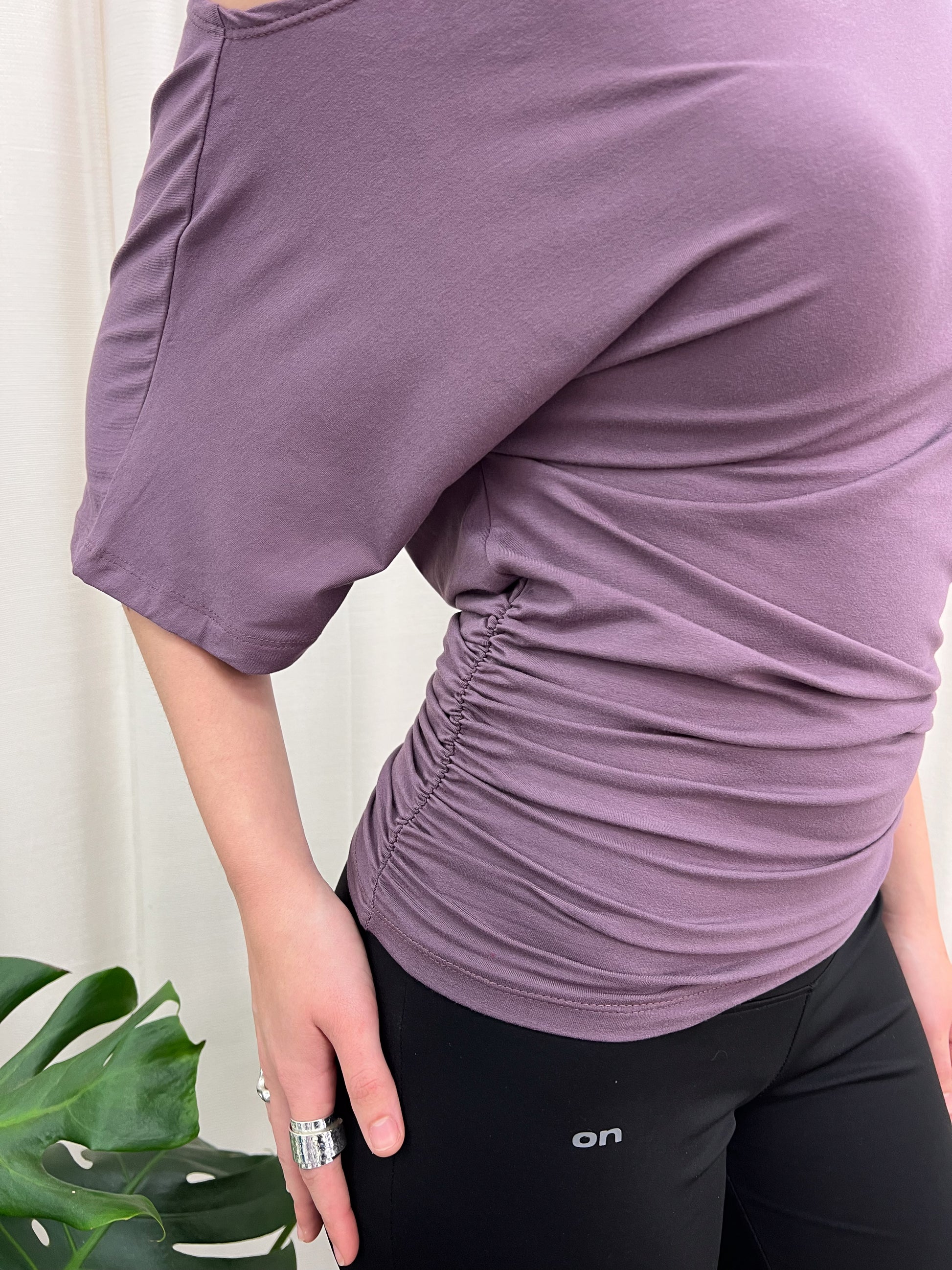 Product details: Draped off shoulder top with elasticated ruching down the side seams. Fabric is a super soft, buttery stretch.