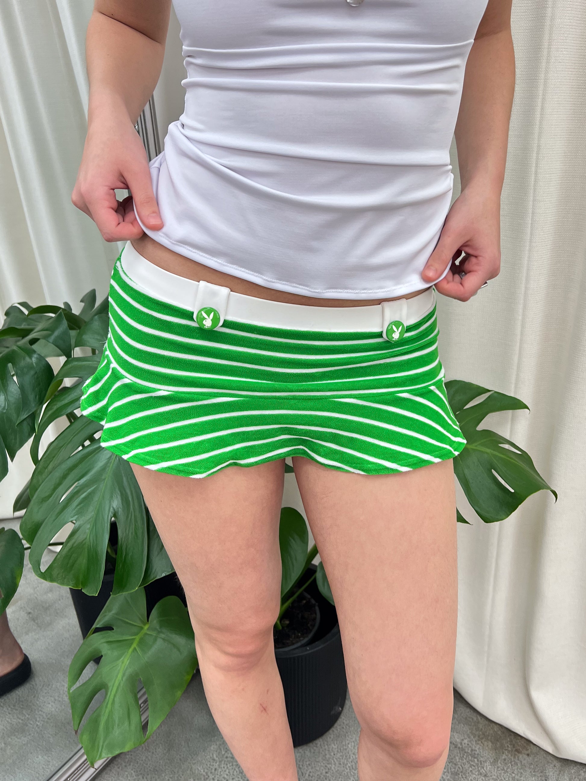 Product details: Extra micro mini swim skirt with belt loops and Playboy logo buttons. Elasticated waistband.